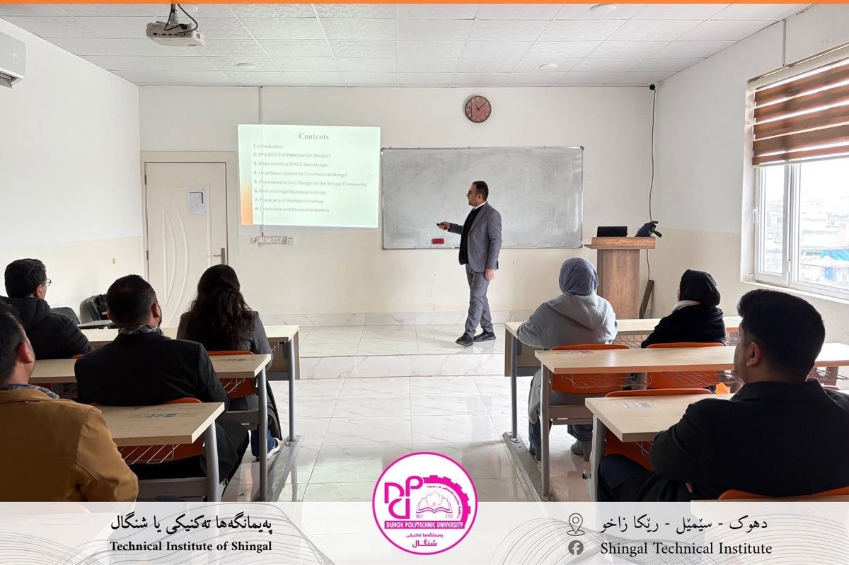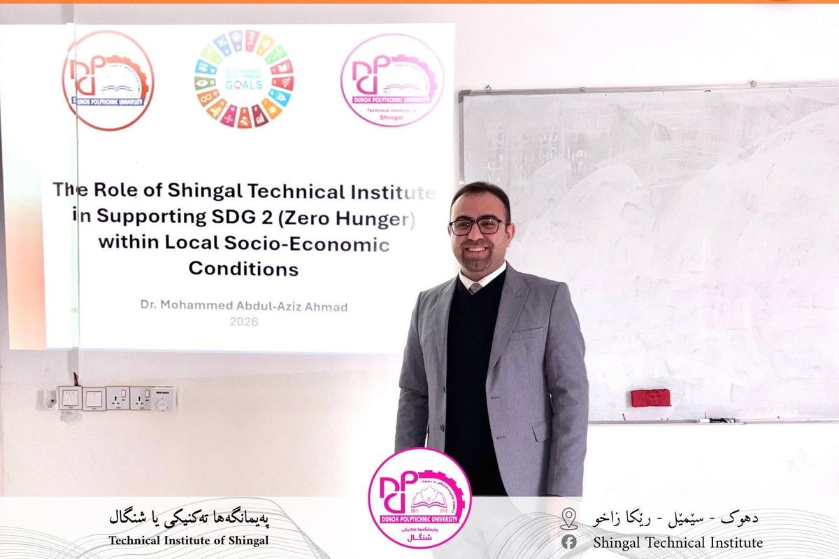 Within the framework of the Sustainable Development Goals (SDGs), and in support of the second goal of the Sustainable Development Goals (Zero Hunger), the Technical Institute of Shingal organized a scientific seminar on 18/01/2026, in the presence of the Assistant Dean, heads of scientific departments, and faculty members. The seminar was delivered by Dr. Mohammed Abdulaziz Ahmed, Head of the Department of Business Administration and representative of the Technical Institute of Shingal at the Presidency of Duhok Polytechnic University, under the title: