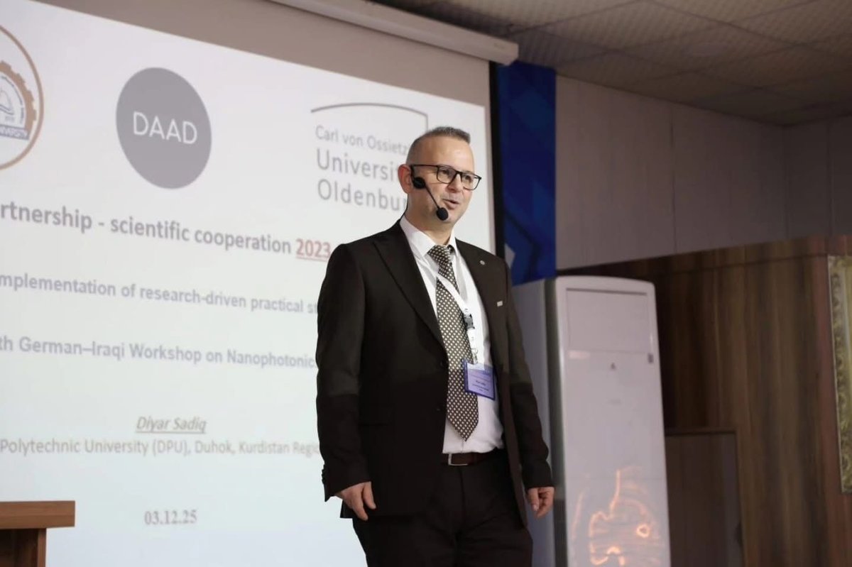 Under the supervision of Prof. Dr. Ari Adel, President of Duhok Polytechnic University, and with the participation of five German lecturers and thirty lecturers from universities across the governorates of Iraq and the Kurdistan Region, along with a number of administrators, faculty members, and researchers, the first day of the Iraqi–German Nanophotonics Workshop was held on Wednesday, December 3, 2025, from 9:00 a.m. to 4:00 p.m.